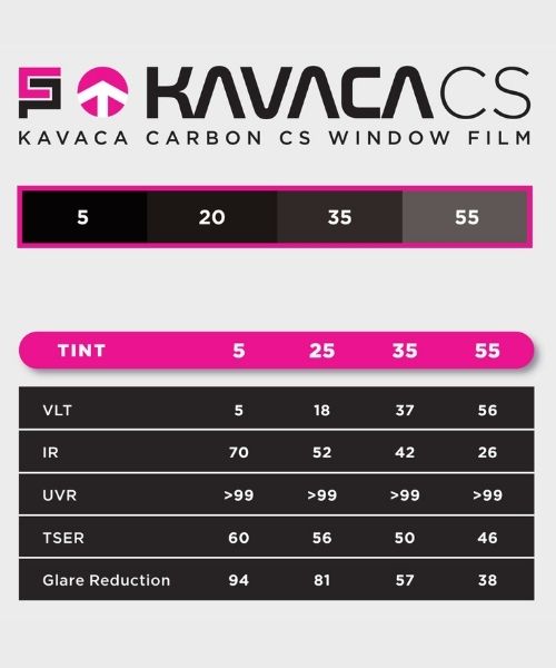 KAVACA Carbon Color Stable window film offers vehicle owners more bang for their window tint dollar. It’s a superior and diverse window tint, available in black or charcoal in various tint percentages. KAVACA Carbon CS is infused with non-metallic nano-carbon technology. KAVACA Carbon CS window tint blocks up to 99% of cancer-causing UVA and UVB rays, produces crystal clear visibility, and is supported by a LIFETIME WARRANTY. KAVACA Carbon CS filters 70% of infrared heat.